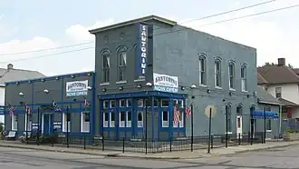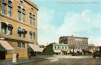 Fountain Square is the first commercial historic district in Indiana,[6][7][8] and it is the only portion of the city outside the initial mile square that has continually operated as a recognized commercial area since the 1870s.[9] Its significance is not only as an early commercial district, but additionally as one developed and dominated by German-American immigrants, merchants, and entrepreneurs, who established a strong German character on the city's southside.[10] From the 1920s to the 1950s, Fountain Square was the city's main entertainment district,[11] with as many as seven theaters in operation at one point in time.[12]