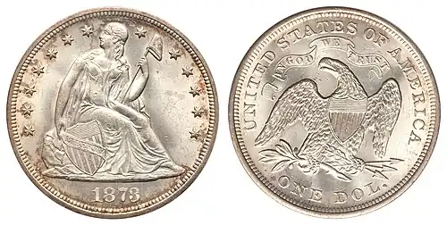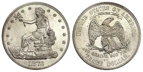 The Coinage Act of 1873 or Mint Act of 1873 was a general revision of laws relating to the Mint of the United States. By ending the right of holders of silver bullion to have it coined into standard silver dollars, while allowing holders of gold to continue to have their bullion made into money, the act created a gold standard by default. It also authorized a Trade dollar, with limited legal tender, intended for export, mainly to Asia, and abolished three small-denomination coins. The act led to controversial results and was denounced by critics as the "Crime of '73".