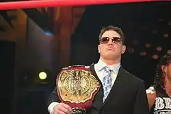 With Styles' recent shortcomings, Flair adopted X Division standout Kazarian as his newest protégé on the May 27 episode of Impact!, much to Styles' dismay.[11][12] On the June 17 episode of Impact!, Flair announced that he would reform the legendary stable Four Horsemen under the new name Fourtune (though not legally permitted to use the Four Horsemen moniker due to WWE's ownership) and compared Styles to his former Four Horsemen partner Arn Anderson, Kazarian to Barry Windham, Roode and Storm to Ole Anderson and Tully Blanchard and Wolfe to Lex Luger, while also stating that each of them would have to earn their spots in the group.[3] Flair, wanting peace between Styles and Kazarian, booked them in a tag team match against Samoa Joe and TNA Global Champion Rob Terry at Victory Road.[13] The plan seemed to work as Styles and Kazarian worked together and were victorious due to outside interference from Desmond Wolfe and, on the July 15 episode of Impact!, Flair announced that Styles and Kazarian had earned their spots in Fourtune.[14][15] Wolfe confronted Flair and demanded a membership in the group, but was not given one due to his long losing streak.[15] On the July 22 episode of Impact!, Styles defeated Rob Terry to win the Global Championship, after some assistance from Kazarian, and the following week renamed the title the TNA Television Championship.[16][17] That same night Fourtune's lineup was seemingly completed with the addition of Robert Roode and James Storm as the final two members, leaving Desmond Wolfe outside the group.[17]