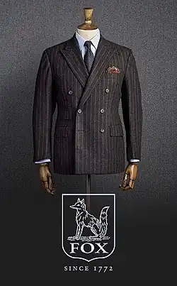 The company presently supplies designer Ralph Lauren, Gieves & Hawkes, and Savile Row tailoring houses, Huntsman, Dege & Skinner, Anderson & Sheppard and Henry Poole, the official founder of Savile Row.[1][5] The company collaborated in 2010 with shoe retailer Clarks to make cloth for its classic desert boot for the Spring/Summer 2010 season.[4] and Mackintosh included a stylish raincoat made from Fox fabric in the collection on display in their first ever shop, opened in London's prestigious Mount Street at the start of 2011. Lock & Co., founded 1676, is using Fox cloth extensively in its 'Lock & Roll' men's wear collection for Spring/Summer 2011. All but one of the caps in the collection are made from Fox cloth, following the success of the Autumn/Winter caps made from Fox fabrics, which it launched in 2010.