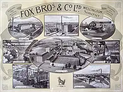 Fox Brothers originated in the clothier business of the Were family of Wellington. Their headquarters were at Trade Court, South Street, Wellington; they also owned two fulling mills.[3] In 1768, Thomas Were's 21-year-old grandson Thomas Fox (1747-1821) joined the company, becoming partner in 1772 and sole proprietor in 1796.[3] He introduced the FOX cloth mark and changed the name of the company (Fox Brothers from 1826).[3] Thomas and his wife Sarah Smith, built in 1807, then lived in, Tone Dale House, Wellington – the house is still lived in by Ben Fox, five generations later.[3] During the Industrial Revolution the company brought wool sorting, spinning, drying and weaving under one roof.[4] It once owned nine mills, including Tonedale Mills and Tone Works, and employed nearly 5,000 workers.[5] During the First World War it won a War Office contract to provide 852 miles (1,371 km) of khaki coloured cloth for military puttees.