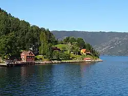 Frønningen is a village in Lærdal Municipality in Vestland county, Norway. It is located in the far northwestern corner of the municipality, east of where the Aurlandsfjorden empties into the main Sognefjorden. Prior to 1992, this area was a part of the old Leikanger Municipality, but on 1 January 1992 it was transferred to Lærdal Municipality. Frønningen only had 17 inhabitants in 2001, and there is no outside road connection. The only access to Frønningen is by a ferry that goes between the three villages of Kaupanger, Frønningen, and Gudvangen.[2]