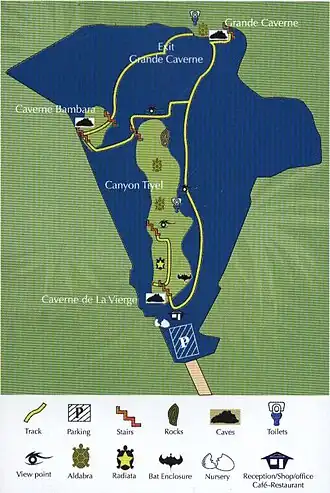 The cave system in the reserve includes the Grande-Caverne (500 meters long) and the Caverne-de-la-Vierge (255 meters), along with others that are closed or not yet rehabilitated. The reserve's tours include a trip through the caves, which are the only caves in the Indian Ocean equipped with lights.