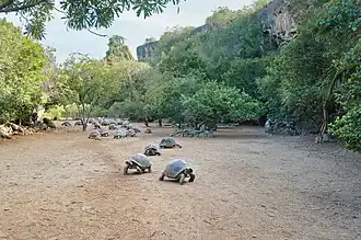 The vegetation is being restored and over 100,000 plants from 33 indigenous and endemic species have been planted. The giant tortoises perform an important role - once played by Rodrigues extinct giant tortoise species - of rejuvenating and maintaining the ecosystem, through their grazing and movements.[5][6]