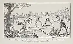 At 05:00 on 27 April, Caylus arrived to duel with Entraguet at the Porte Saint-Antoine near the horse market.[7] Caylus brought with him two seconds, Maugiron and Livarot, while Entragues brought Schomberg and Ribérac for his part. According to the contemporary writer Brantôme, the dispute had arisen over the affections of a woman.[8] For the first time in French history the seconds for both sides would participate in the duel that followed. The men fought largely in silence with their rapiers.[9] At the opening of the duel, Maugiron had called out to Ribérac that they were to fight each other.[10] Ribérac thrust at Maugiron, sending Maugiron falling backwards dead, however Ribérac was unable to steady himself and fell forward onto the sword of his deceased opponent.[11] Only Livarot and Entraguet would survive the encounter.[12] Ribérac was not killed immediately on the field, and the duke of Guise took him to his residence, the hôtel de Guise where he convalesced for before expiring at noon the following day.[8][5][13]