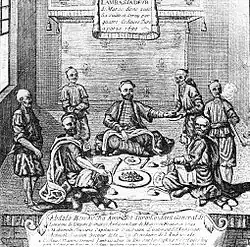The first Moroccan mission to France was that by Al-Hajari in 1610–11, who was sent to Europe by the Moroccan ruler to obtain redress against the ill-treatment of the Moriscos.[9] Soon after, Ahmed el-Guezouli visited France in 1612–1613. He first went with Nasser Carta to the Netherlands, where he obtained the intercession of the States General for a visit to France; and then to France where he endeavoured to obtain the restitution of the library of Moulay Zidane, which had been taken by Jean Philippe de Castelane.