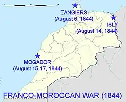 After the troubled periods of the French Revolution and the Napoleonic Wars, France again showed a strong interest in Morocco in the 1830s, as a possible extension of her sphere of influence in the Maghreb, after Algeria and Tunisia. The First Franco-Moroccan War took place in 1844, as a consequence of Morocco's alliance with Algeria's Abd-El-Kader against France. Following several incidents at the border between Algeria and Morocco, and the refusal of Morocco to abandon its support to Algeria, France faced Morocco victoriously in the Bombardment of Tangiers (August 6, 1844), the Battle of Isly (August 14, 1844), and the Bombardment of Mogador (August 15–17, 1844).[19] The war was formally ended September 10 with the signing of the Treaty of Tangiers, in which Morocco agreed to arrest and outlaw Abd-El-Kader, reduce the size of its garrison at Oujda, and establish a commission to demarcate the border. The border, which is essentially the modern border between Morocco and Algeria, was agreed in the Treaty of Lalla Maghnia.