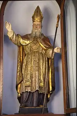 Carved and painted wooden statue of St. Francesco Fogollo on display in a church in the Italian Catholic Diocese of Massa Carrara-Pontremoli.