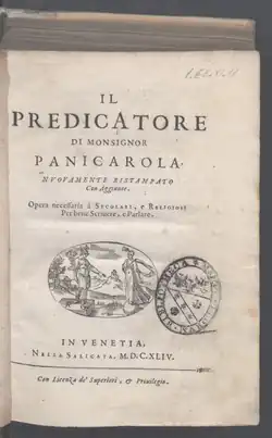 - "Il Predicatore di F. Francesco Panigarola ... overo Parafrase, comento e discorsi intorno al libro dell' Elocutione di Demetrio Falerco ...", Venice, 1609.