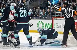![]() Charron signals after Philipp Grubauer makes a save during a 2023 game | |