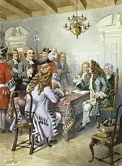 In 1707, Makemie was arrested by Lord Cornbury, the governor of New York, for preaching without a Crown-issued license, as required under the Toleration Act. He spent two months in jail before being released on bail. At trial, he produced his preaching license from Barbados, and was acquitted, though he faced heavy legal costs.[3] This case became a landmark victory for religious freedom in America. The controversial Lord Cornbury was recalled to England the following year.