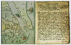 Nicholson was exposed to French activities on the Mississippi River while governor of Maryland. He warned the Board of Trade in 1695 that the French were working to complete the designs of explorer Robert La Salle to gain control of the river and dominate the Indian relations in the interior, which "may be of fatal consequence" to the English colonies.[48] He reiterated the warning in a 1698 report, and suggested that the Board of Trade issue instructions to all of the governors encouraging the development of trade with Indians across the Appalachian Mountains. "I am afraid", he wrote, "that now please God, there is a peace, the French will be able to doe more dammage to these Countrys, than they were able to doe in the [King William's] War ."[49] These observations were among the earliest anyone made concerning the threat French expansion posed to the English, and some of his suggestions were ultimately adopted as policy.[49] He actively promoted the idea of expansionist trade on the frontier with other colonial governors, including Bellomont of New York, and Blake of South Carolina.[50]