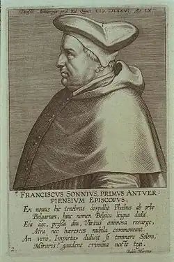 Franciscus Sonnius (12 August 1506 – 30 June 1576) was a theologian during the time of the Catholic Reformation, the first bishop of 's-Hertogenbosch and later the first bishop of Antwerp. His family name was Van de Velde, but in later years he called himself after his native place, Son in Brabant. He came from the same noble family as philosopher Heymeric de Campo. The family has three golden mill-irons in their coat-of-arms, a sign that is depicted on the chair of the first bishop in the cathedral of Antwerp.