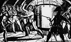 However, they were soon met by a French man of war and forced to flee. After their escape, they captured a schooner near Bermuda and then, as they neared Saint Kitts, they captured a sloop on July 4, 1724. During this latest capture, the crew were tortured by Spriggs and his crew by hoisting the prisoners as high as the main or top sails and dropping them against the deck.