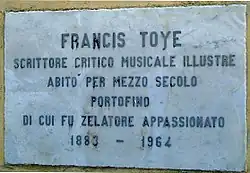 Toye died in Florence at the age of 81.[6] His fellow critic, Neville Cardus, wrote of him, in an obituary tribute in The Guardian, "Years ago he was critic for the old Morning Post, and as typical a Morning Post man as well could be, distinguished in presence, a connoisseur of music, good food, and wine, rather unapproachable at first sight, but once known extremely likeable, a representative in excelsis of the old school, fastidious yet humane."[24] The Gramophone called him "the man who loved Verdi this side of idolatry, and who loved Handel and Sullivan no less. His books on Verdi and Rossini will always be well thumbed, and the restoration of the supremacy of Italian opera in England owes much to his advocacy."[25]