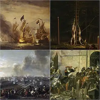 The news that the French had penetrated into the heart of the Republic led to a general panic in the cities of the province of Holland. Blaming the States regime for the Dutch collapse, their populations rioted. Members of the city councils were by force replaced by Orangist partisans or in fear of reprisals declared for the cause of the Prince of Orange.[49] Pamphlets accused the regenten of having betrayed the Republic to Louis and De Ruyter of wanting to deliver the fleet to the French.[50] When the French peace terms became known on 1 July, they caused outrage.[51]