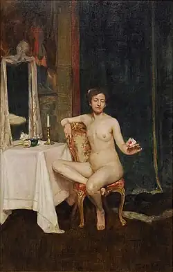 Linton had a special affinity for portraits of women. He exhibited An Evening's Reminiscence at the 1904 St. Louis World's Fair, a full-length painting of a nude woman seated before her dressing table and examining a rose.[10] He painted an imperious full-length portrait of the dancer Ruth St. Denis, and a sensual full-length portrait of Ada Forman, a member of St. Denis's dance troupe. The Silver Heel was his playful full-length portrait of his friend and former student, Agnes Allen.[11]
