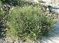 This is a shrub which grows in open landscapes on soils rich in salts and gypsum. It grows alongside other halophiles such as saladillo (Varilla texana).[4] It is gray-green to blue-green in color for most of the year except fall, when it turns bright red.[4] The wiry stems may just exceed half a meter tall and the shrub takes on a rounded appearance. The small grayish or bluish leaf blades are coated in white hairs. The plant may bloom anytime between September and May,[2] especially after rain falls.[4] The flower is white with a yellow center.[4] The plant makes very few seeds.[2]