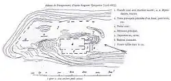 Working the irregularities of the ground, the castle was built on two superposed terraces. The entry was situated on the south flank and lead to a large square, surrounded by walls thus delimiting a courtyard flanked by the dependences and a dungeon. The principal body of the structure dominated the fosse and gave access to a smaller courtyard. From there, traces of a wall indicate what must have been a rectangular building (approximately 60 x 30m). The latter was flanked on the west side by oval casemate structures, double walling of which A. Quiquerez provided a drawing dating from the 1850s. Most probably a chapel was constructed to the centre part of the building elevated above the fosse. Furthermore, it had a well or cistern in the northern part.