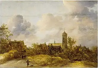 Frans executed a number of variations on the theme of a river landscape with boats and village. In his late paintings he combined the low horizon and light-filled sky of the contemporary Dutch school of tonal landscape painting, with the delicacy of the figures, feathery trees and buildings of the Italian-Flemish tradition of which his uncle Joos was a leading representative.[2]