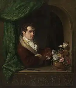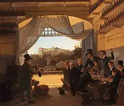 In 1824 he painted Crown Prince Ludwig at the Spanish Wine Tavern in Rome (Neue Pinakothek, Munich) a work commissioned by the prince himself, who is shown at an informal gathering of artists, mostly German, with a view of the Aventine Hill visible through an open door.[3] He settled at Macerata in 1830, but returned home on a visit in 1840, on which occasion a professorship was bestowed on him by the King of Prussia.[1]