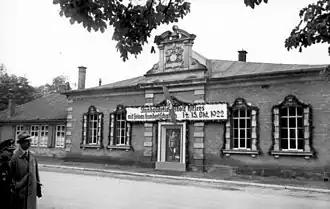 In 1926, Schede founded Der Weckruf ("The Wake-Up Call"), the first Nazi propaganda newspaper at the local level in Germany. Here he ran an extra-parliamentary opposition with lurid articles about alleged "scandals" designed to destabilize the political system of the Weimar Republic.[8] In 1928, the paper began a slander and harassment campaign against Abraham Friedmann, the Jewish General Director of the Coburg meat company Großmann AG. Friedmann was initially successful in fighting these attacks and managed to get the City Council to fire Schwede from his job at the Municipal Works in 1929. The outraged Nazis demanded Schwede's immediate reinstatement and when the city refused a petition began circulating to dissolve the City Council.[6] On 5 May 1929 the recall passed with 67% of the vote. In the ensuing re-election campaign, which included public speeches in Coburg by Adolf Hitler himself, the Nazis won 43.1% of the popular vote and 13 of the 25 seats in June 1929. This was the first instance where the NSDAP held an absolute majority in a local government in Germany.[9] At the newly elected Council's opening session, Schwede was promptly rehired to the Municipal Works.