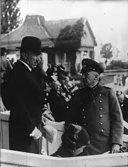 After the Turks signed an armistice with the Allies on 30 October 1918, the German Asia Corps was ordered home, and Papen was in the mountains at Karapinar when he heard on 11 November 1918 that the war was over.[25] The new republic ordered soldiers' councils to be organised in the German Army, including the Asian corps, which General Otto Liman von Sanders attempted to obey, and which Papen refused to obey.[26] Sanders ordered Papen arrested for his insubordination, which caused Papen to leave his post without permission as he fled to Germany in civilian clothing to personally meet Field Marshal Paul von Hindenburg, who had the charges dropped.[27]