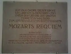 Count Franz von Walsegg (January 17, 1763 – November 11, 1827) was a German aristocrat, living in Stuppach Castle near Gloggnitz, who is best remembered for having commissioned a Requiem Mass from Wolfgang Amadeus Mozart in 1791 following the death of his twenty-year-old wife Anna (the grieving count, only 28 himself at the time, would never remarry). A Freemason and amateur musician, Walsegg had a penchant for commissioning works from composers of the day and then passing them off as his own in private performances. In his account of the commission of the Requiem Mass from Mozart, Anton Herzog states: