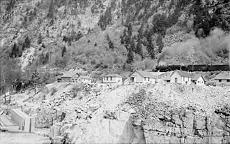 At Hells Gate, near Boston Bar, the canyon walls rise about 1,000 metres (3,300 ft) above the rapids. Fish ladders along the river's side permit migrating salmon to bypass a rockslide that diverted the river during the blasting of the Canadian Northern Railway line in 1913. The area around Hell's Gate carries the name Black Canyon, which may either be a reference to the colour of the rocks when it rains, or the name of a community built on the cliffsides here during the Fraser Canyon Gold Rush. At the site that once housed railway workers, a tourist attraction built in 1971 takes visitors across Hell's Gate via an aerial tramway.