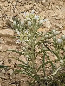 When a plant is ready to bloom it grows many branched stems with leaves attached to opposite sides. These cauline leaves are shorter, 4–8 centimeters long and just 6–9 millimeters wide.[6] Other species in the Frasera genus tend to have stems that stand up straight while those of Frasera coloradensis lean away from each other.[4] The inflorescences are branched panicles with many greenish-white flowers with purple dots, each with four petals 8-10 mm long.[3][5]
