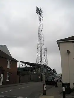 Fratton Park's four corner floodlight towers, erected in 1962, became well known in Portsmouth and also acted as a useful landmark for visiting away supporters. Since 2015, the four towers were gradually replaced by modern roof-level lights. One surviving floodlight tower, from the north-west corner, was renovated and relocated to Fratton Park's main car park on 15 July 2019 for preservation, albeit without its lighting lamps, which were not required and removed.[8] The preserved floodlight tower now also acts as a telecommunications antenna tower.