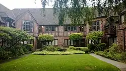 Most Anhalt apartments, especially those he built in Seattle's Capitol Hill and Queen Anne neighborhoods such as Anhalt Arms (formerly Berkeley Court), feature landscaped interior courtyards. These courtyards, which are shaded and recessed from the street, provide a semi-private, outdoor common space for residents. Unlike many apartments built during the pre-war era, many Anhalt Apartments also possess both a front and a back door. The front door faced inwards, either onto a small alcove or landing shared with one to three other apartments, or directly onto the interior courtyard.[11] These design decisions were intended to foster both a sense of privacy for individual tenants, and a sense of community within the building as a whole.[12]
