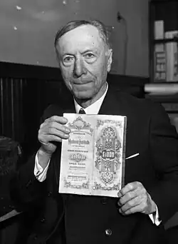 ![]() Fred Lind Alles in 1936, holding a bond of $1,000 from the Mechanics Institute of Los Angeles | |