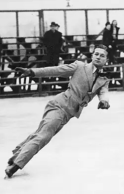 ![]() Tomlins performing an inside edge spread eagle at the 1939 World Championships | |