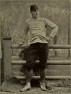 Remington attended the art school at Yale University and studied under John Henry Niemeyer.[1] Remington was the only male student in his first year. He found that football and boxing were more interesting than the formal art training, particularly drawing from casts and still life objects. He preferred action drawing and his first published illustration was a cartoon of a "bandaged football player" for the student newspaper, Yale Courant.[13] Though he was not a star player, his participation on the strong Yale football team was a great source of pride for Remington and his family. He left Yale in 1879 to tend to his ailing father, who had tuberculosis. His father died a year later, at 50, receiving respectful recognition from the citizens of Ogdensburg. Remington's Uncle Mart secured a good-paying clerical job for his nephew in Albany, New York, and Remington would return home on weekends to see his girlfriend Eva Caten. After the rejection of his engagement proposal to Eva by her father, Remington became a reporter for his uncle's newspaper and went on to other short-lived jobs.