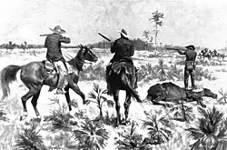 Living off his inheritance and modest work income, Remington refused to go back to art school and instead spent time camping and enjoying himself. At 19, he made his first trip west, going to Montana,[14] at first to buy a cattle operation and then a mining interest, but realized that he did not have sufficient capital for either. In the American West of 1881, he saw the vast prairies, the quickly shrinking bison herds, the still unfenced cattle, and the last major confrontations of US Cavalry and Native American tribes, scenes he had imagined since his childhood. He also hunted grizzly bears with Montague Stevens in New Mexico in 1895.[15] Though the trip was undertaken as a lark, it gave Remington a more authentic view of the West than some of the later artists and writers who followed in his footsteps, such as N. C. Wyeth and Zane Grey, who arrived twenty-five years later when much of the mythic West had already slipped into history. From that first trip, Harper's Weekly printed Remington's first published commercial effort, a re-drawing of a quick sketch on wrapping paper that he had mailed back east.[16] In 1883, Remington went to rural Kansas,[17][18] south of the city of Peabody near the tiny community of Plum Grove,[19] to try his hand at the booming sheep ranching and wool trade, as one of the "holiday stockmen", rich young easterners out to make a quick killing as ranch owners. He invested his entire inheritance but found ranching to be a rough, boring, isolated occupation which deprived him of the finer things he was used to from East Coast life, and the real ranchers thought of him as lazy. In 1884, he sold his land.[20]