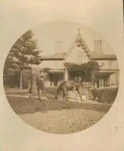 The Remingtons' substantial Gothic revival house was situated at 301 Webster Avenue, on a prestigious promontory known as Lathers Hill. A sweeping lawn rolled south toward Long Island Sound, providing views on three sides of the beautiful Westchester County countryside. Remington called it Endion, an Ojibwa word meaning "the place where I live".[33] In the early years, no real studio existed at Endion and Remington did most of his work in a large attic under the home's front gable where he stored materials collected on his many western excursions. Later he used his library on the main floor, a larger, more comfortable room that soon took on the cluttered appearance of an atelier. However, neither situation was completely satisfactory: the space was limited, the light was less than adequate, and the surroundings were generally uninspiring. In the spring of 1896 Remington retained the New Rochelle architect O. William Degen to plan a studio addition to the house. An article in the New Rochelle Pioneer of April 26 touted the "fine architectural design" of the studio. Remington himself wrote to his friend the novelist Owen Wister:[34]