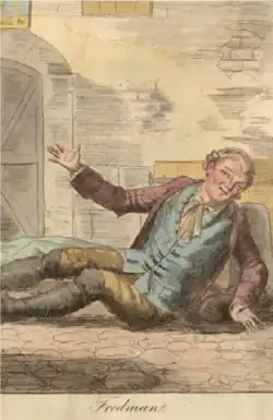 Jean Fredman is the key figure in Carl Michael Bellman's works from the 18th century, the Songs of Fredman and the Epistles of Fredman.[2] Bellman let Fredman be the supposed narrator of his songs and poems. Originally it was thought that Fredman would play a part similar to that of the apostle Paul in the Bible, writing epistles to his "congregation". The first song about Fredman was about his funeral, and would later become number 26 in Songs of Fredman.[3]