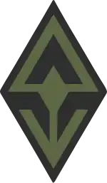 The Legion uses the white-blue-white flag instead of the official white-blue-red flag of Russia.[10][18] The letter L, the first letter of the words Legion and Liberty, is also used by the Legion as one of its symbols. On the right sleeve, the Legion wears the flag of Ukraine, like other Ukrainian foreign legions.[39][25]