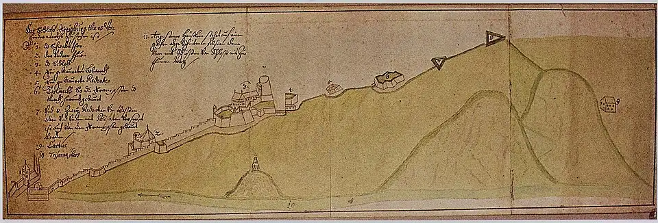 1.↑ Hans Schadeck,Burg und Stadtbefestigung von Freiburg bis zum Ende des 16. Jahrhunderts (Castle and fortifications of Freiburg until the end of the 16th century), page 9, in Stadt und Festung Freiburg, published by Stadtarchiv Freiburg im Breisgau, 1988