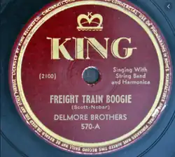 "Freight Train Boogie" is a country music song written by Alton and Rabon Delmore under the pseudonyms, Jim Scott and Bob Nobar. The song was recorded by The Delmore Brothers in Cincinnati. It was released in 1946 on the King label (catalog no. 570-A). In December 1946, it reached No. 2 on the Billboard folk chart.[1] It was also ranked as the No. 30 record on the Billboard 1946 year-end folk juke box chart. Often the recording is regarded as one of the first Rock and Roll recordings.[2]
