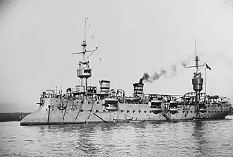 Alger was sent with the protected cruiser Isly on a cruise to French Indochina, departing in October 1895.[5][8] She remained on station in the Far East in 1896,[9] and returned to France in February 1897.[5] After arriving home, she was assigned to the Mediterranean Squadron for the annual maneuvers that were conducted in July.[10] That year, while in Toulon, the ship had her masts replaced.[4] Alger had been deactivated and placed in the reserve fleet by January 1901.[11] During this period, the ship underwent additional refits.[4] The ship's activities in the mid-1900s are unclear; Thomas Brassey's The Naval Annual lists Alger among the vessels that took part in the fleet maneuvers in 1906, which began on 6 July with the concentration of the Northern and Mediterranean Squadrons in Algiers. The maneuvers were conducted in the western Mediterranean, alternating between ports in French North Africa and Toulon and Marseille, France, and concluding on 4 August.[12] But according to the historians John Jordan and Philippe Caresse, Alger had been reactivated in 1905 for another deployment to the Far East, along with the armored cruisers Bruix and Dupetit-Thouars, the protected cruiser Guichen, four gunboats, and five destroyers.[13]