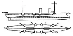 Armor protection consisted of wrought iron, the primary component of which was the main armor deck. It was that was 40 mm (1.6 in) thick, layered on 10 mm (0.39 in) of normal hull plating, on the flat portion that covered most of the ship. Toward the sides of the hull, it sloped downward to provide a measure of vertical protection, and in increased significantly in thickness to 90 mm (3.5 in), tapering slightly to 85 mm (3.3 in) where it connected to the sides of the ship. The sloped portion of the deck was also mounted on 10 mm of hull plating, apart from the bottom edge, where it increased to 15 mm (0.59 in) to compensate for the reduced thickness of the deck. Below the deck and above the propulsion machinery spaces, a thin 8 mm (0.31 in) splinter deck protected the engine and boiler rooms from shell fragments that penetrated the main deck. The conning tower had 70 mm (2.8 in) of iron plating on the sides, and the ship's main and secondary guns were fitted with 54 mm (2.1 in) thick gun shields.[2][4]