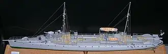 The main armament of the Arquebuse-class ships consisted of a single 65-millimeter (2.6 in) gun forward of the bridge and six 47-millimeter (1.9 in) Hotchkiss guns in single mounts, three on each broadside. They were fitted with two single rotating mounts for 381-millimeter (15 in) torpedo tubes on the centerline, one between the funnels and the other on the stern.[1]