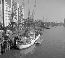 The wharf narrowly escaped destruction during the Second World War when its southern neighbour, Nicholson's Wharf, was flattened by a V-1 flying bomb.[26] A regular passenger and cargo service between the wharf and the Canary Islands was maintained for a number of years after the war by the 10,123-ton MV Monte Ulia[1] and its 7,723-ton sister ship MV Monte Urquiola, operated by Naviera Aznar SA.[27] Such vessels were among the largest merchant ships ever to visit the Pool of London.[28] Writing in 1963, James Harold Bird observed how "during his lunch-hour the pale-faced London office worker can lean on the downstream parapet of London Bridge and watch Canary Island produce being unloaded to New Fresh Wharf below from vessels up to 500 feet long and delivered to a ten-storey warehouse."[29] The warehouse was constructed in 1953[30] and provided four million cubic feet of storage space. By this time the wharf had five travelling cranes and two conveyors, capable of transporting loads of up to five tons. Its river frontage measured 585 feet (178 m).[31]