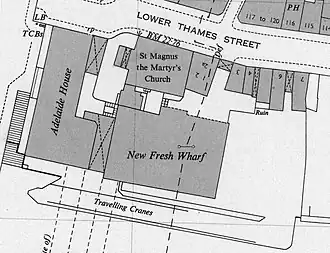 The date of establishment of Fresh Wharf is not known. In late Anglo-Saxon times (10th–11th century), the site of Fresh Wharf appears to have been merely a beach on which ships were grounded for off-loading.[5] A wharf was built there at some subsequent point during the medieval period; its name was first recorded as Fresshffysshewharfe in 1363, which was probably related to its appointment as one of the places authorised for the unloading of fish.[6] On the landward side, the wharf was accessed via Lower Thames Street a short distance down from the church of St Magnus-the-Martyr.[7] Excavations of 1974–5 on the site revealed much about the medieval buildings. [8]