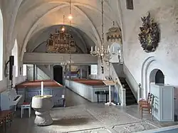 Of the church furnishings, the baptismal font and the triumphal cross both date from the 13th century. An altarpiece made in northern Germany circa 1480 deserve special mention. It depicts the Holy Family and relatives. Other furnishings are mostly from the 18th century. The unusually elaborate organ is from the 17th century.[2]