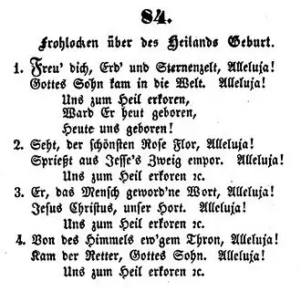 A German paraphrase in four stanzas with a refrain first appeared in 1844 in the collection by the Diocese of Leitmeritz, Katholische Gesänge für die öffentliche und häusliche Andacht, zunächst zum Gebrauche der Gläubigen der bischöflichen Leitmeritzer Diöcese, for congregational and personal devotion.[2] The song was titled "Frohlocken über des Heilands Geburt" (Rejoicing about the Saviour's birth). The stanzas in seven lines differ only in their first and third lines, while the second and fourth is Halleluja, and the last stanzas are a refrain: "Uns zum Heil erkoren, ward er heut geboren, heute uns geboren." (For our salvation chosen, he was born today, today for us born).[2] The song was included in regional parts of the first edition of the Catholic hymnal Gotteslob in 1975.[4]