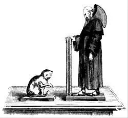 Although "the Weather friar" has been sometimes wrongly cited as the oldest hygrometer-meteorologist in the world,[1][3] there is a similar hygrometer, with the shape of a Capuchin friar as well, from the late 18th century, in the Museum of Arts and Crafts in Paris, built by Charles Alexandre Clair and belonging to the physics office of Jacques Charles, who would bequeath his collection of gadgets to the State on January 15, 1792, with the National Assembly preparing an inventory of it where the existence of this object, very popular circa 1842, according to the first volume of the book Maison rustique du XIXe siècle, Encyclopédie d'Agriculture pratique, published under the direction of the scientific popularizer Charles-François Bailly de Merlieux, where a hygrometer is also mentioned in which the image of a Turk moves a saber to indicate the weather, similar to the friar moving the pointer and the hood of the habit.[5] : 7 Similarly, at the Palaiseau Polytechnic School there is a hair hygrometer from 1809 in which a female figure moves her right arm to indicate on a scale the amount of water vapor in the air, dating the use of human hair to measure humidity to the year 1775, when Horace-Bénédict de Saussure decided has used it to develop what is considered the first precise hygrometer (perfected in 1824 by Jacques Babinet with a microscopic reading system). By the way, Santorio Santorio had already described a thread hygrometer in 1623.[6] Likewise, an illustration of two hygrometers represented respectively by the figures of a monk and a cat stands out in Arthur Mangin's book L'air et le monde aérien (1865), both described as popular hygrometers.[7] : 219 There was a clear tendency in the xix century to have hygrometers with decorative drawings in homes, especially in rural areas as an aid to the peasantry's work.[5] : 6