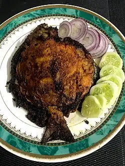 Fried fish is any fish or shellfish that has been prepared by frying. Often, the fish is covered in batter, egg and breadcrumbs, flour, or herbs and spices before being fried and served, often with a slice of lemon.